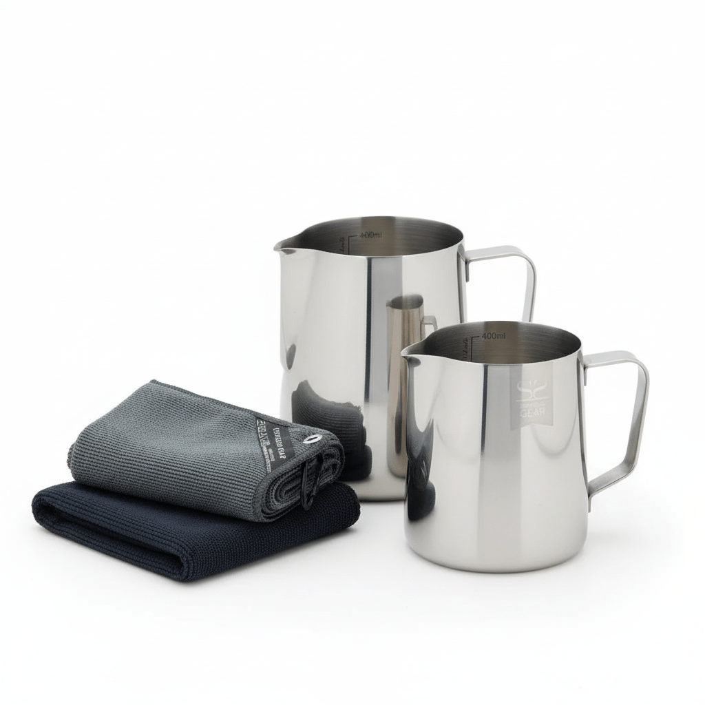 Barista Starter Kit - 2 Mëllechkannen & 3 Barista-Tücher
