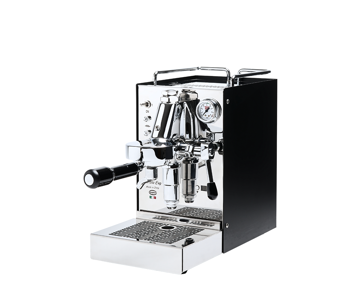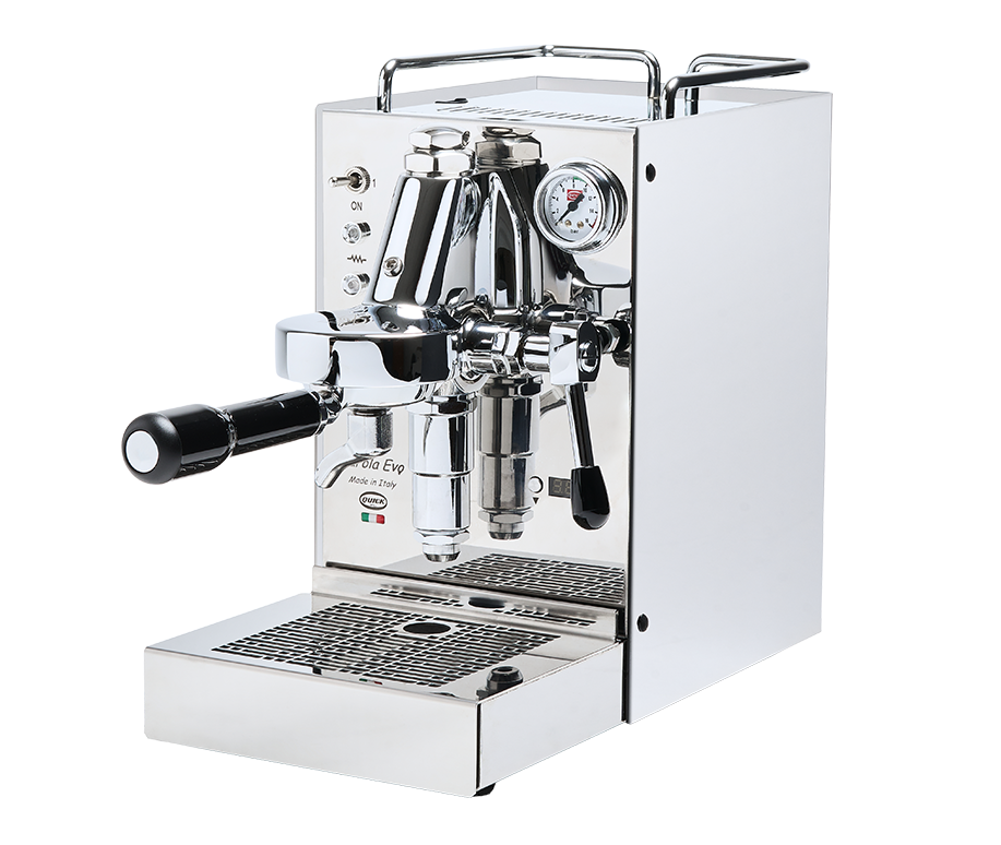 Material: Voll Edelstahl; Säitepanneauen aus Stol oder mattschwaarz; Quick Mill Braugrupp mat Edelstahl-Pilz