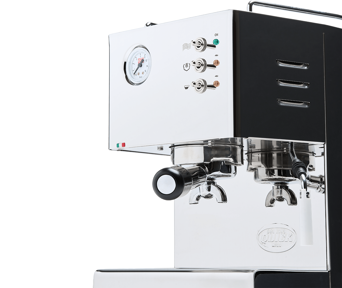 Material: Voll Edelstahl; Quick Mill Brühgrupp mat O-Ring; Dampfstaaf mat Belüfter