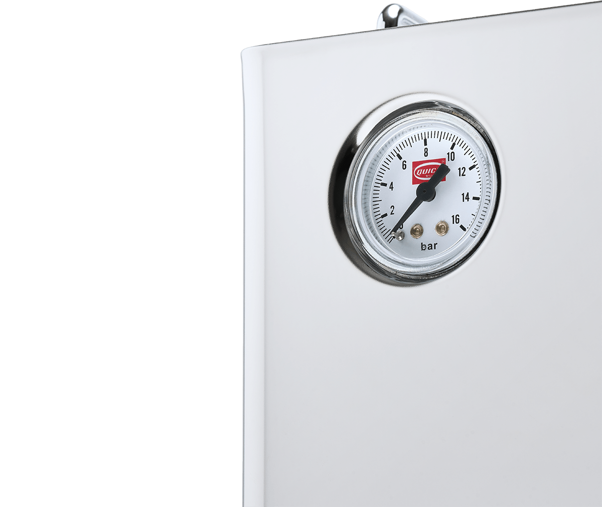 Den Drockmesser (0–16 bar) weist den Braudrock un, sou datt Dir d'Mahlen an d'Doséierung fir eng präzis an ausgeglach Extraktioun upasse kënnt.