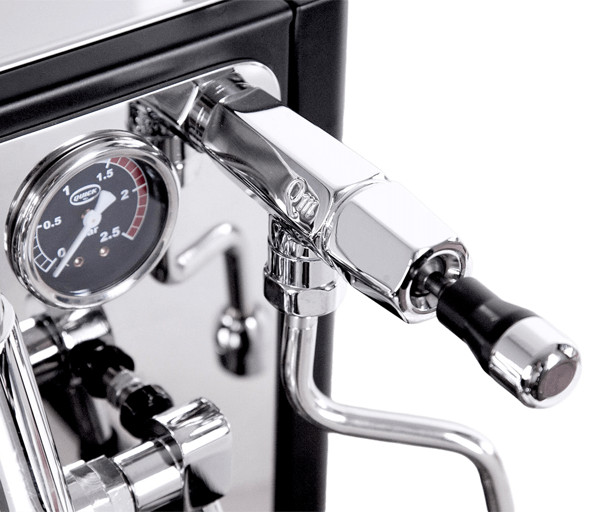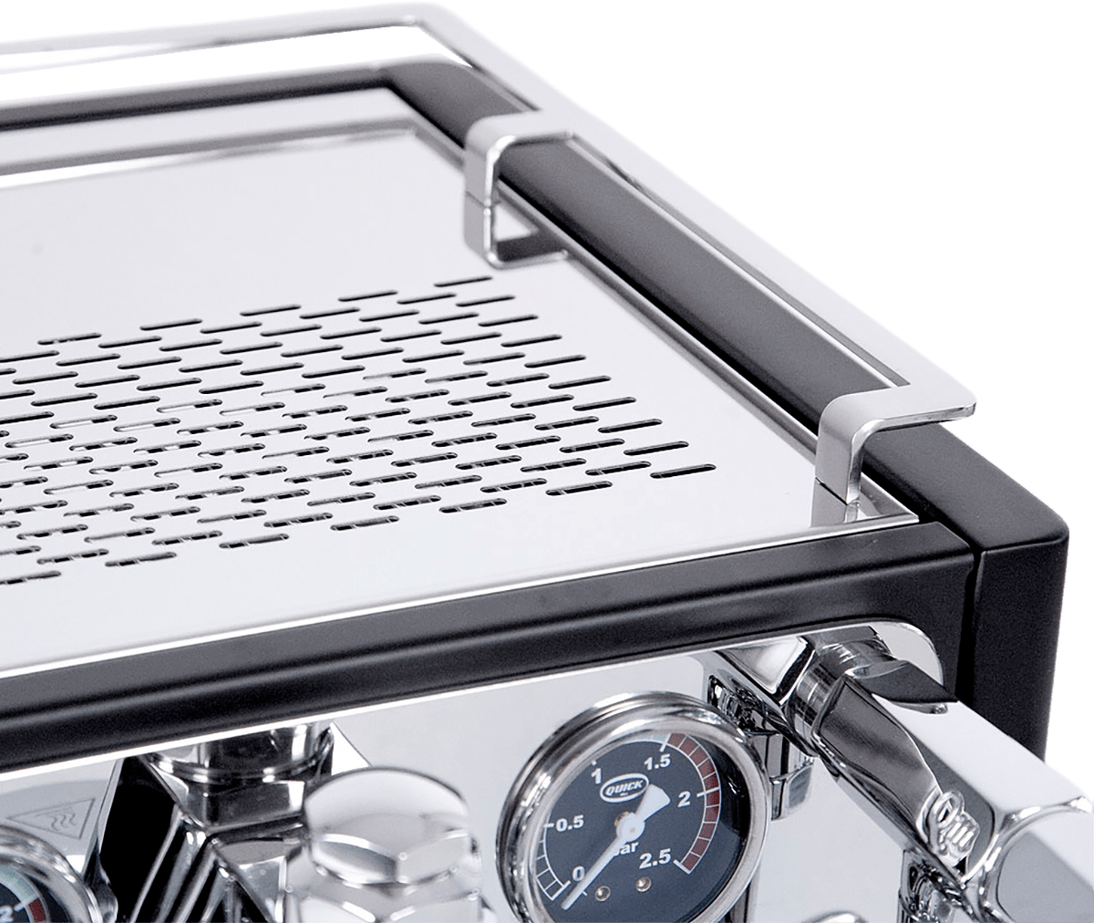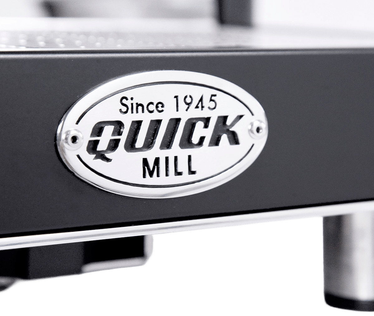 Déi komplett aus Edelstol gemaachte Konstruktioun mat déif schwaarzen Detailer, Joystick-Pins an der Quick Mill Brühgrupp bitt e professionellen visuellen Ausdrock, deen souwuel an d'Kichen wéi och op d'Aarbechtsplaz passt.