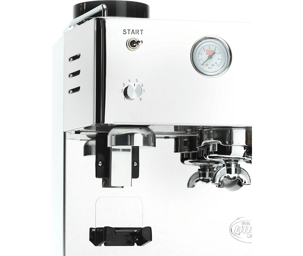Den Drockmesser (0–16 bar) weist den Braudrock a Echtzäit un. Dëst erliichtert d'Upassung vum Malen, der Doséierung an dem Stampen, fir déi ideal Extraktioun ëm 9 bar z'erreechen.
