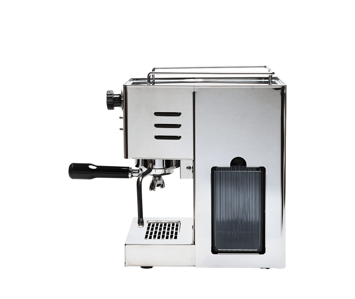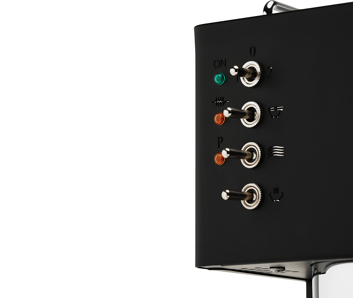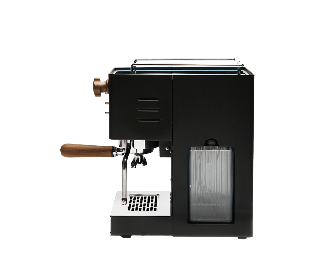 De Chassis an déi baussenzeg Komponenten si aus Edelstol. D'Maschinn gëtt et och an enger mattschwaarzer Versioun mat engem Dampfstaaf aus Holz an engem Portafilter - perfekt fir déi, déi e modernen Design gär hunn.
