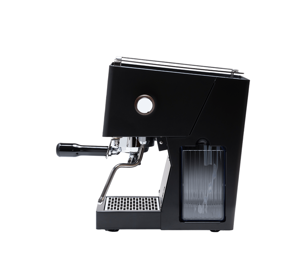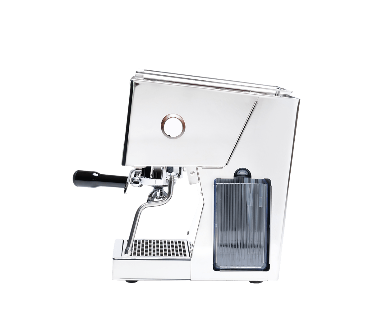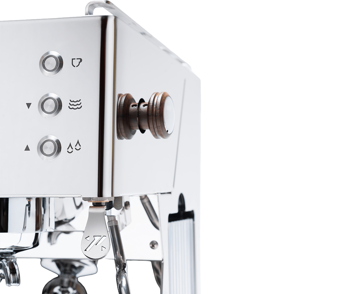 Verfügbar an Edelstol oder Mattschwaarz, béid mat Holzakzenter um Dampfgarer a Portafilter, liwwert d'Ring-Brühgrupp eng konsequent Hëtzt a verlässlech Veraarbechtungsqualitéit.