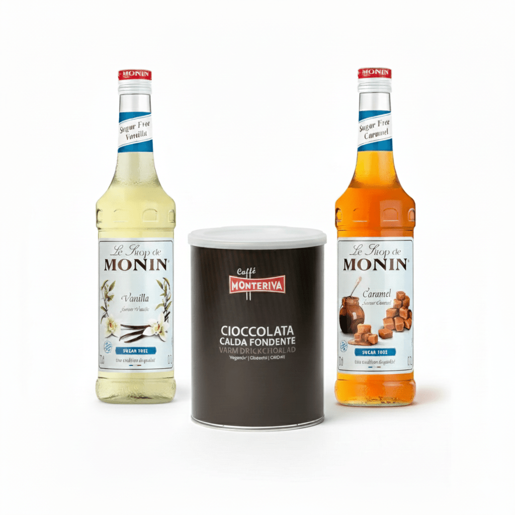 Santa's Sweet Trio kombinéiert alles wat Dir braucht fir luxuriéis waarm Gedrénks doheem ze kreéieren. Dëst Package enthält dräi Premium-Produkter, déi Iech zesummen onendlech Méiglechkeeten ginn, fir italienesch waarme Schockela, aromatiséierte Kaffi a kreativ Mokka-Variatiounen ze genéissen.